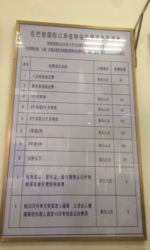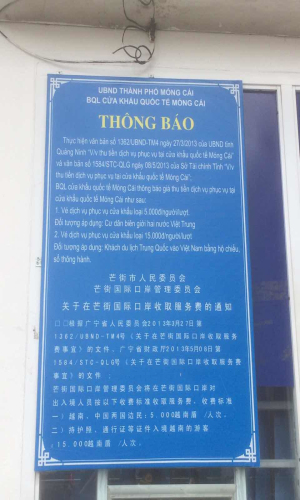 二、通过芒街口岸入、出境时均需交纳口岸服务费,其中持边民证者每次交纳5000越南盾(约合人民币1.5元),持护照、通行证等其它证件者每次交纳15000越南盾(约合人民币4.5元)。芒街口岸收取该费用时将出具相应的口岸服务票。