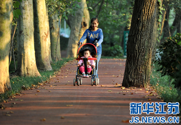 10月22日,一名女士带着孩子在红色的南京环紫金山绿道漫步。
