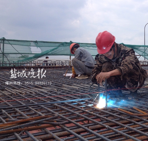 在施工现场,盐城晚报记者看到一位焊接师傅总是笑呵呵的,他正在一段段地焊接钢筋,这位焊接师傅名叫杨运周,家住山东,在范公路LQ4标段工作了近两年,“2012年11月份工程开工时我就来了,到现在也有500多天了,这500多天里家里有事我就会回去,总共回了3次,2次是春节,1次是农忙时候,家里实在忙不过来,”杨运周笑着说。