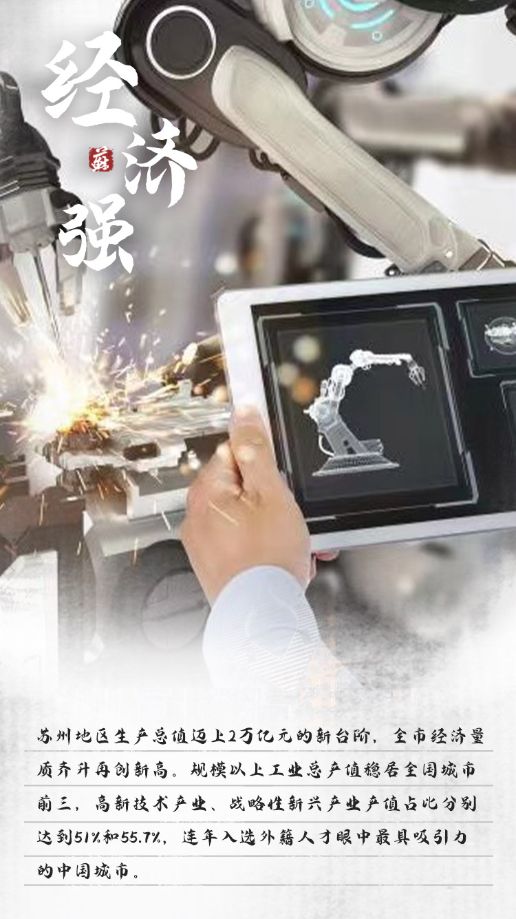 “十三五”时期,苏州开拓创新、砥砺奋进,抢抓长三角一体化等重大历史机遇,经济社会发展取得一系列重大成就。这座历经2500多年城址未变的古城,正不断书写新的现代奇迹,一起来看看吧!2万亿五年来,经济发展量质齐升,创新转型持续深化,综合实力显著增强。2020年,苏州地区生产总值迈上2万亿元的新台阶。规模以上工业总产值稳居全国城市前三,高新技术产业、战略性新兴产业产值占比分别达到51%和55.7%,全市高新技术企业达到9772家,生物医药产业入选国家战略性新兴产业集群。进出口总额和实际使用外资总量保持全国前列。连年入选外籍人才眼中最具吸引力的中国城市。