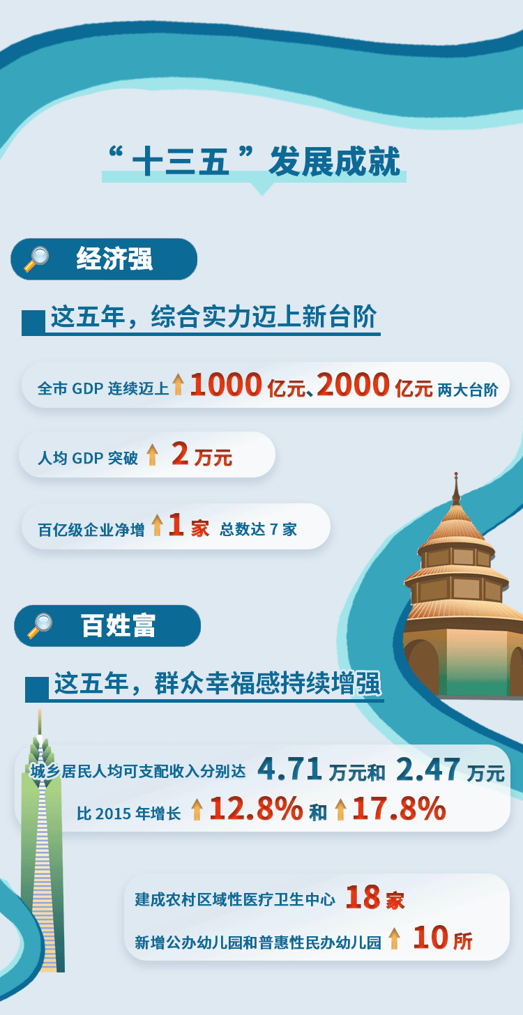 全市GDP连续迈上5000亿元、6000亿元两大台阶,人均GDP突破13万元。江都、仪征工业开票销售突破1000亿元。汽车及零部件、高端装备、新型电力装备等产业集群规模超千亿。百亿级企业净增4家、总数达7家。国家高新技术企业超1600家,是2015年的2.5倍。建筑企业荣获鲁班奖10个。第二批全国小微企业创业创新基地城市示范绩效评价全国第一。创成全国质量强市示范城市。