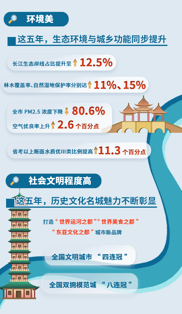 扎实开展长江大保护,率先规划建设江淮生态大走廊,并上升为省级战略,关闭退出化工企业501家,长江生态岸线占比提升至56.9%,林木覆盖率、自然湿地保护率分别达24%、60%。全市PM2.5浓度下降34.5%、空气优良率上升12.2个百分点,省考以上断面水质优Ⅲ类比例提高35.2个百分点。实施城建项目1388个、总投资2408亿元。新建(提升)各类公园近400个。淮河入江水道整治工程顺利竣工,瓜洲泵站建成投用。农村人居环境整治三年行动圆满收官。创成国家水生态文明城市、国土资源节约集约模范市。邗江区获评国家生态文明建设示范区。